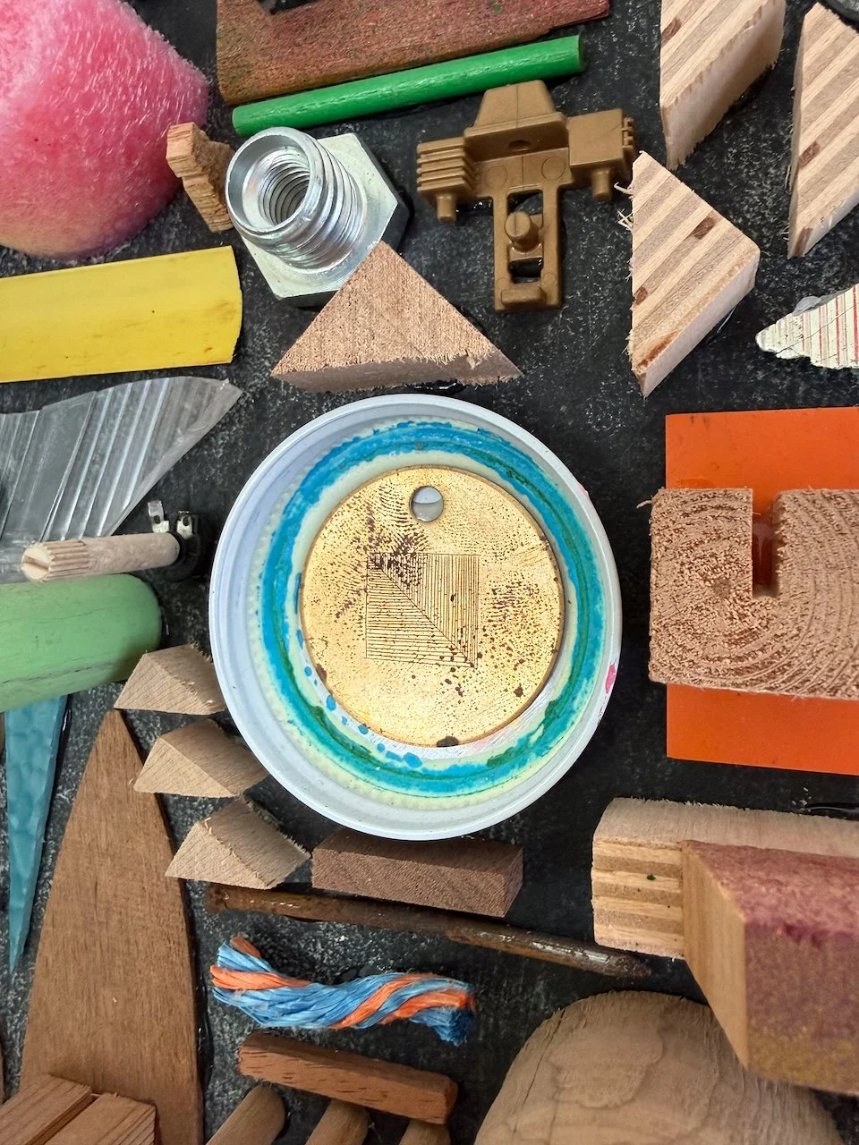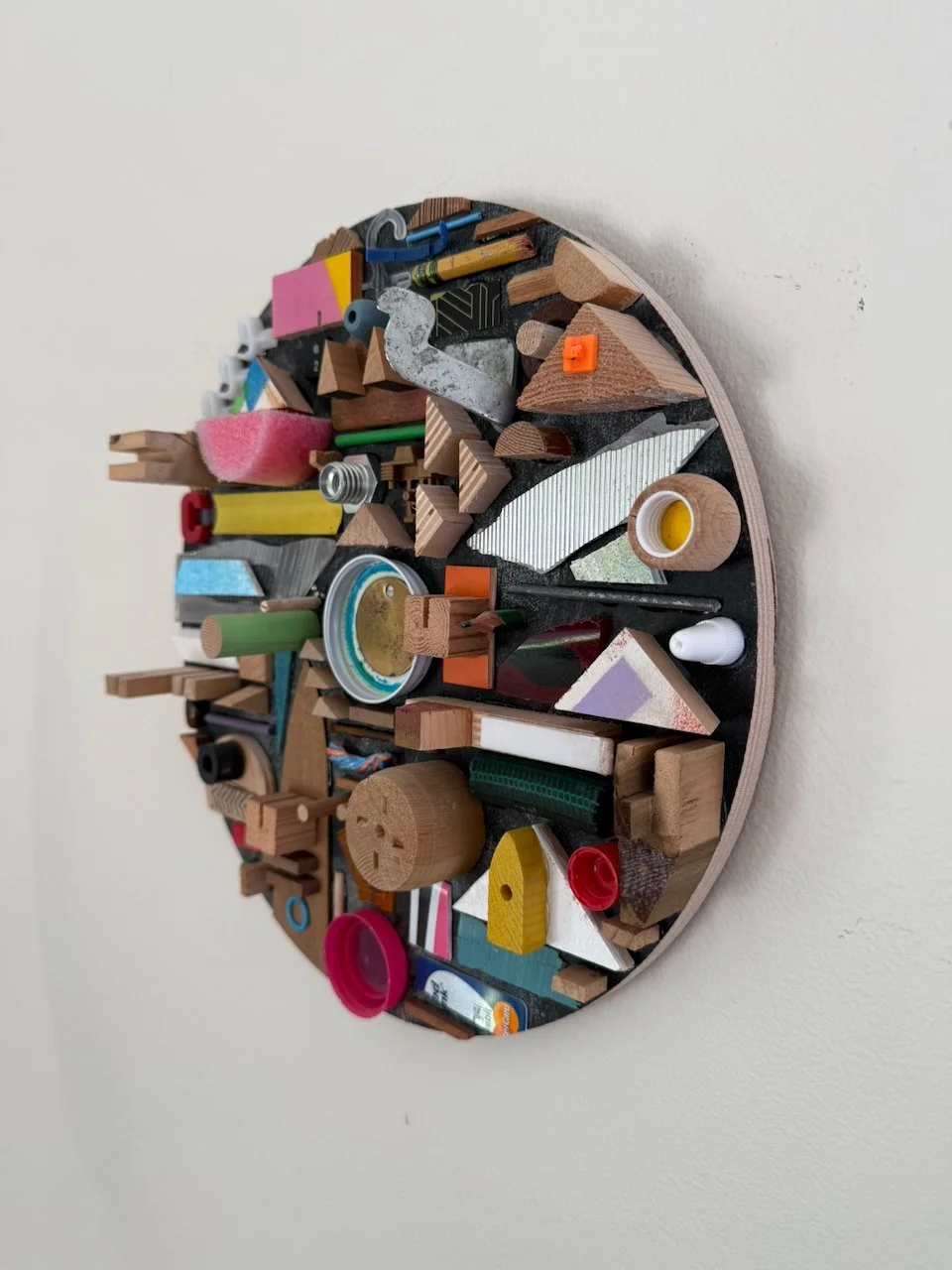 in my memory, the mall of america opened on my birthday (well, in 1992 though). in reality it was a few days after. materials included found plywood backer (already painted by the former owner with chalkboard paint - score!), lobster rope, hand-carved brass disc, azek wedge, C, cheap driveway jewelry, dowel rod, pencil tip.