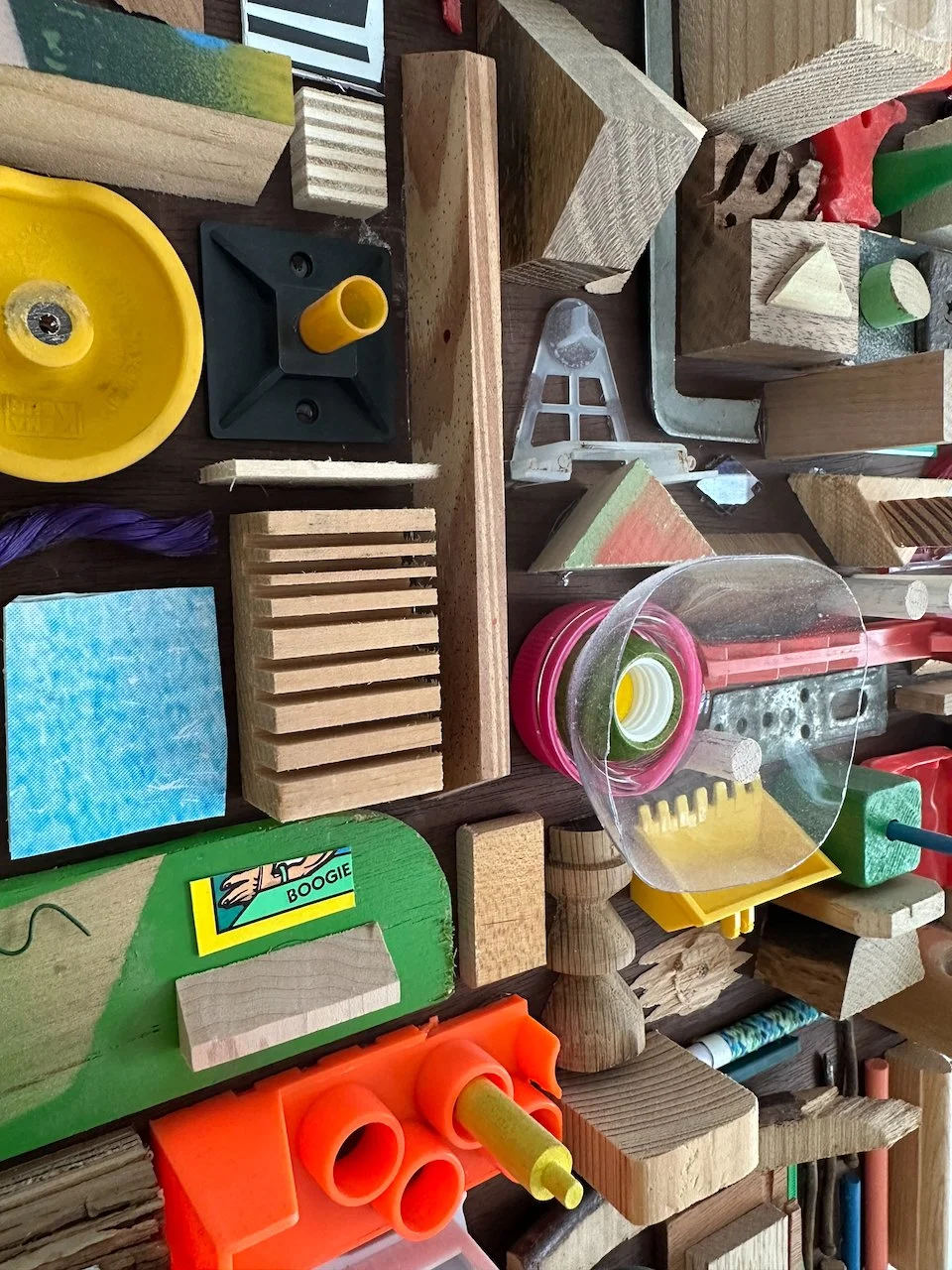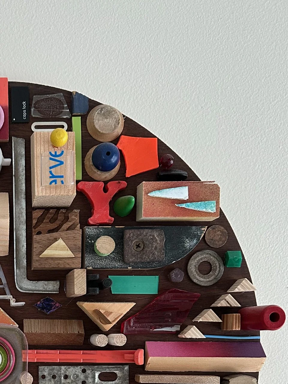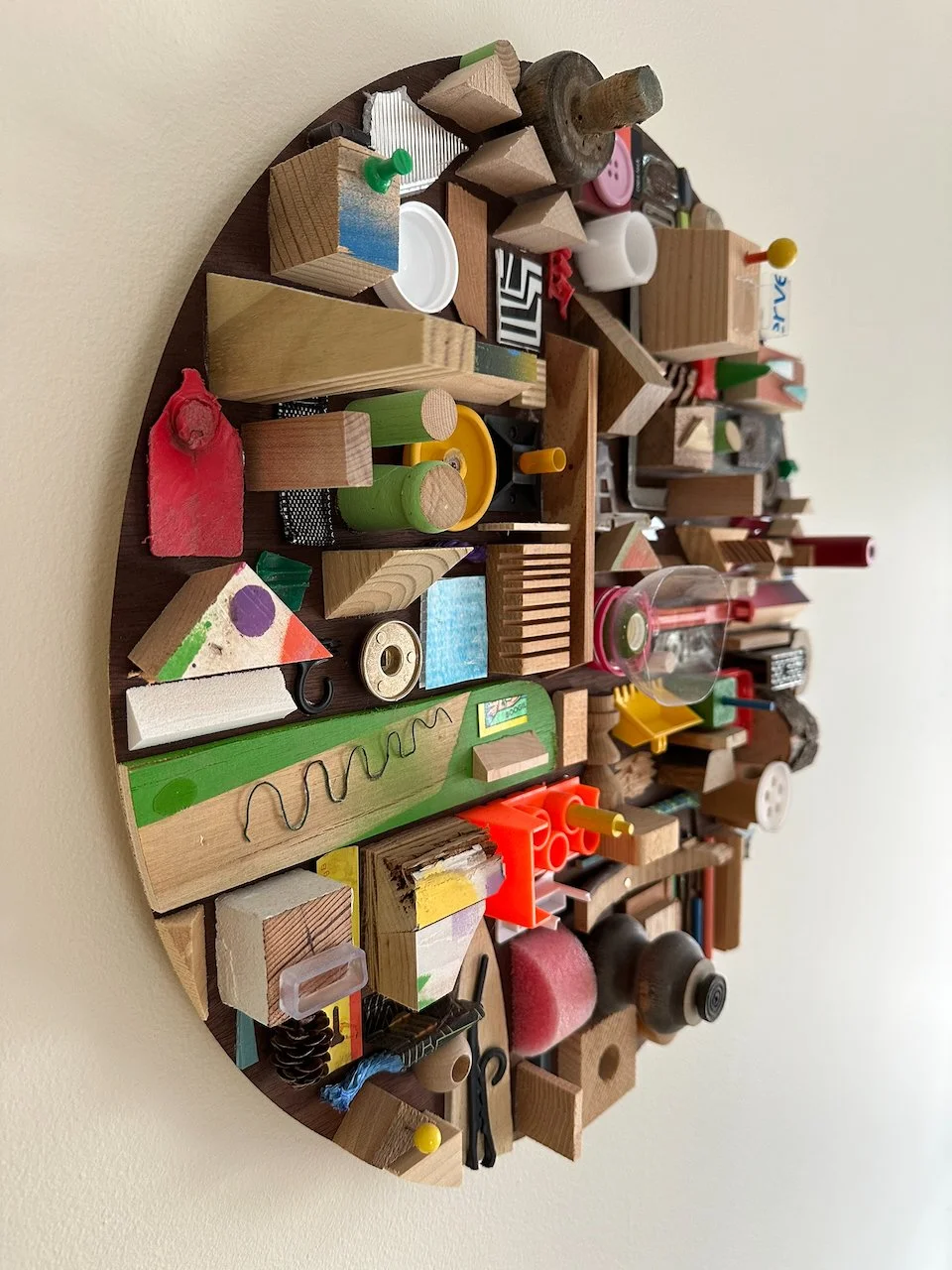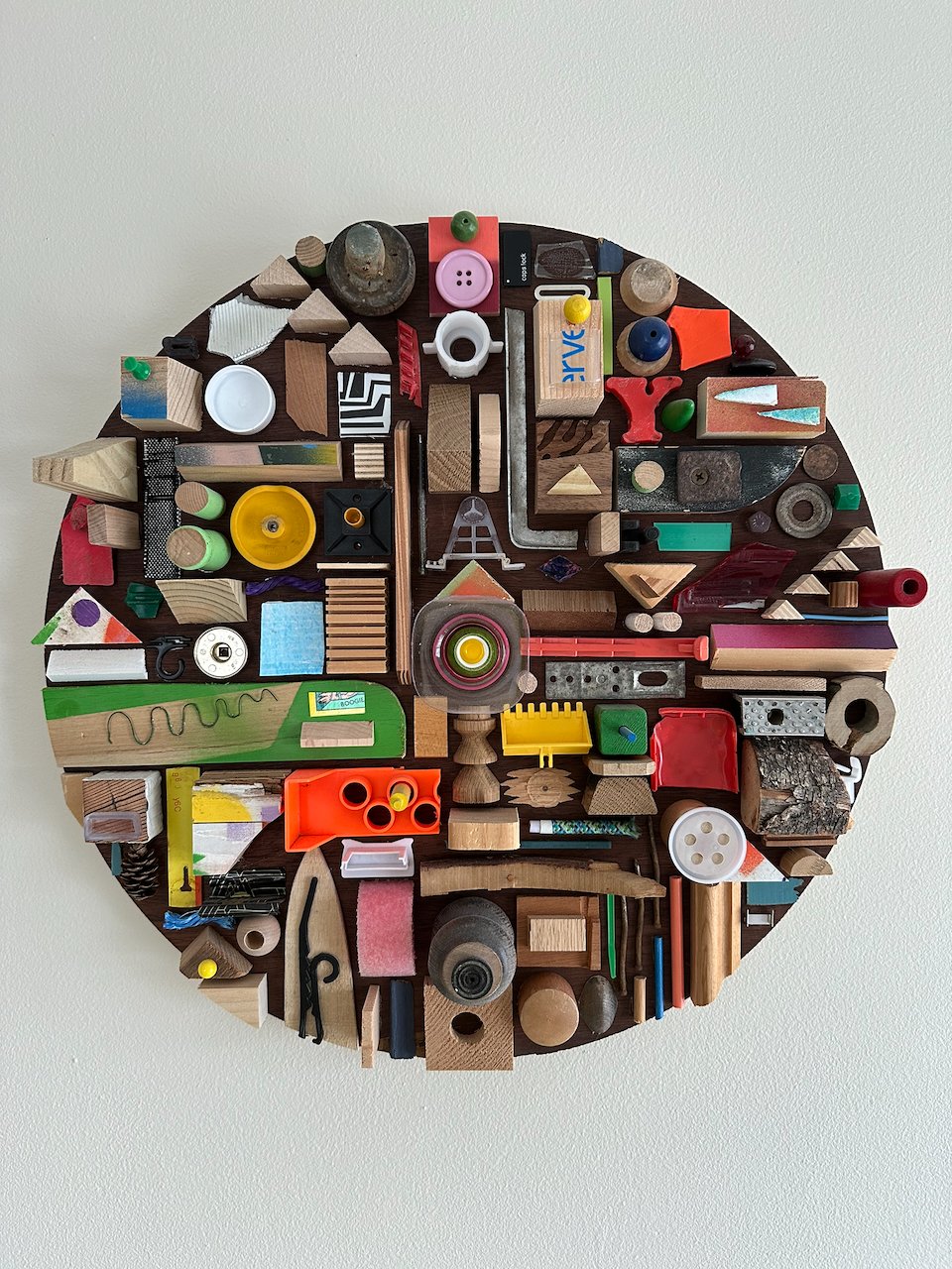 linty peanut butter came about in 2024. materials included found stained poplar backer, half of an old earbud container, some kind of nerf gun component, a button, a toy tractor scoop, wire, a cone from a conifer, various metal pieces and reflector shards. this was also the first time i cut a reverse knife edge around the circumference of the piece to give it more of a feeling that the face with all its bits is floating off the wall.