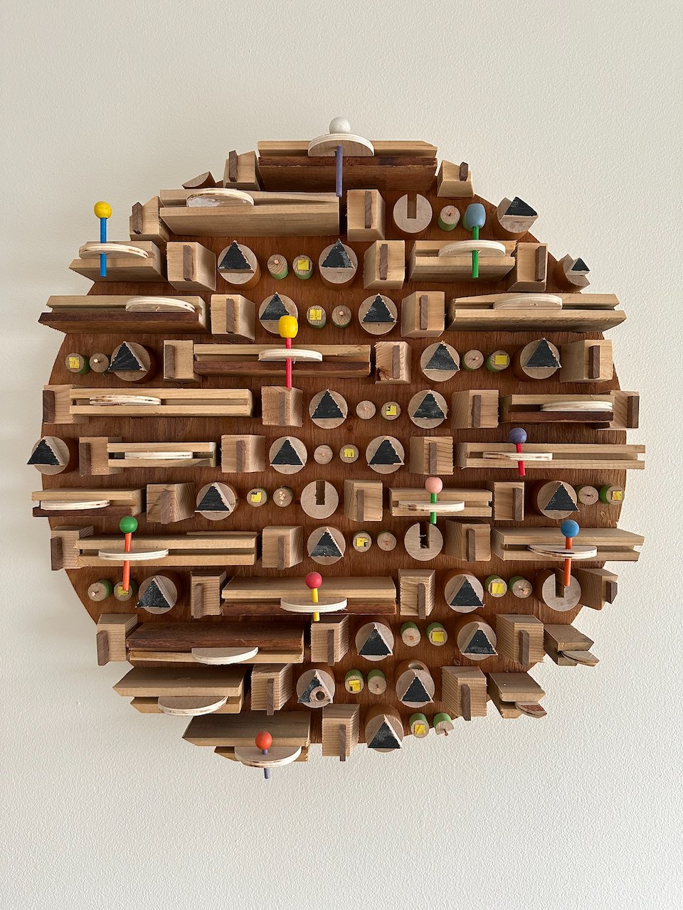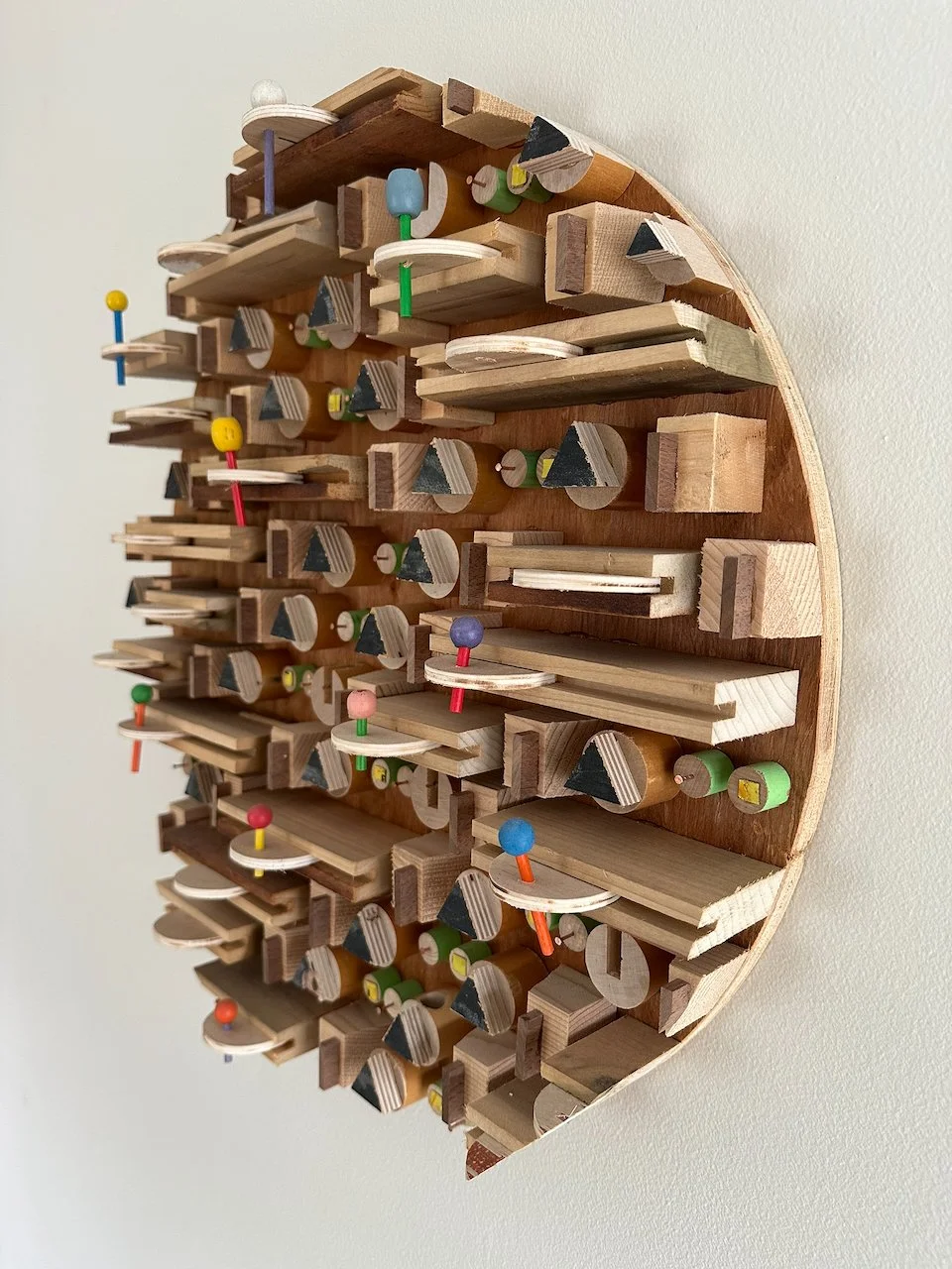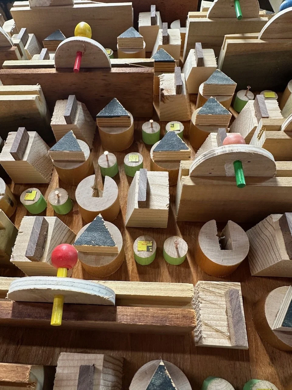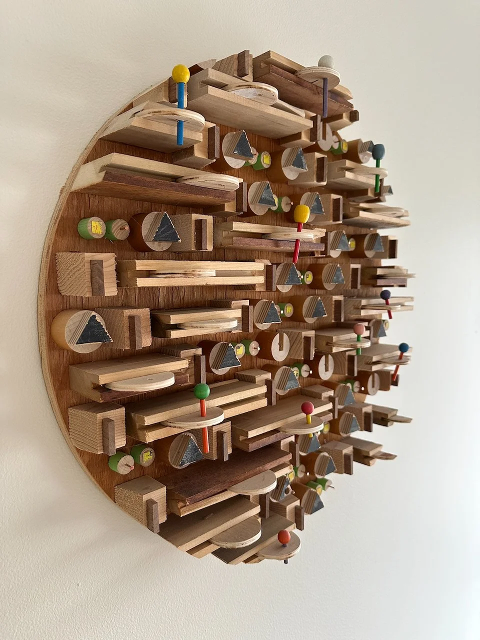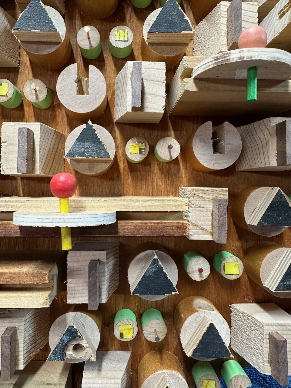 i had an idea for reminder again after looking at one of my original scrap pieces. similar to reminder, i wanted to expand on one small idea from an older piece. materials here included found plywood backer, poplar from an old desk i hauled home and disassembled, salvaged 1/2" baltic birch plywood (which someone had painted with black chalkboard paint), 1/4" plywood, copper nails, slices of the tape from an old tape measure, maple (legs from a chair i got on the sidewalk), hemlock and black walnut remnants and little colored shapes of wood (thanks, mom!). and adhesive.