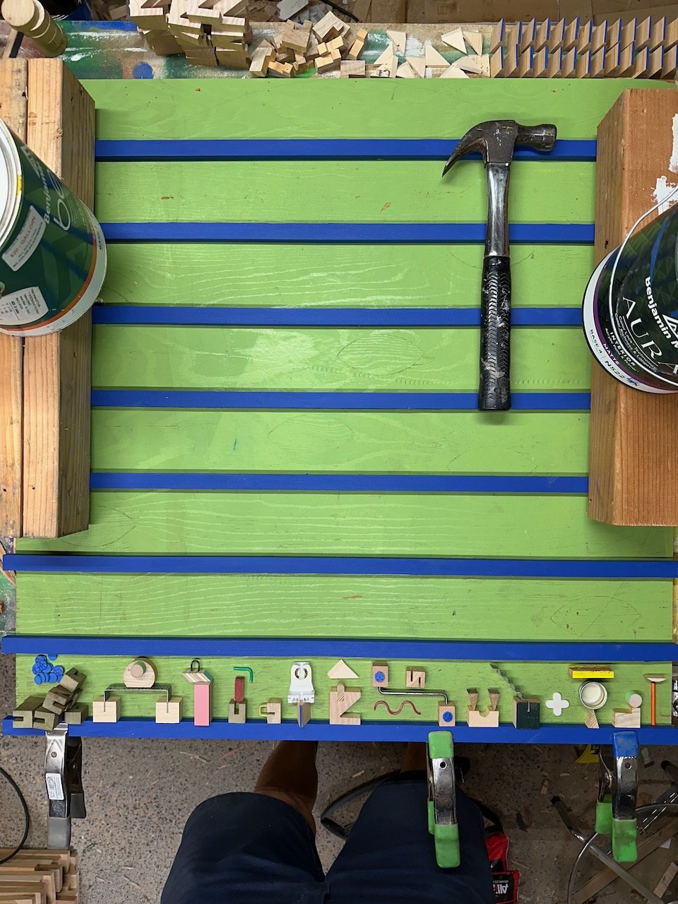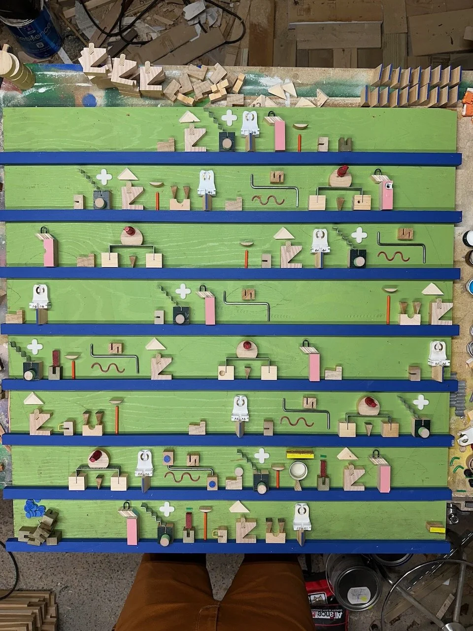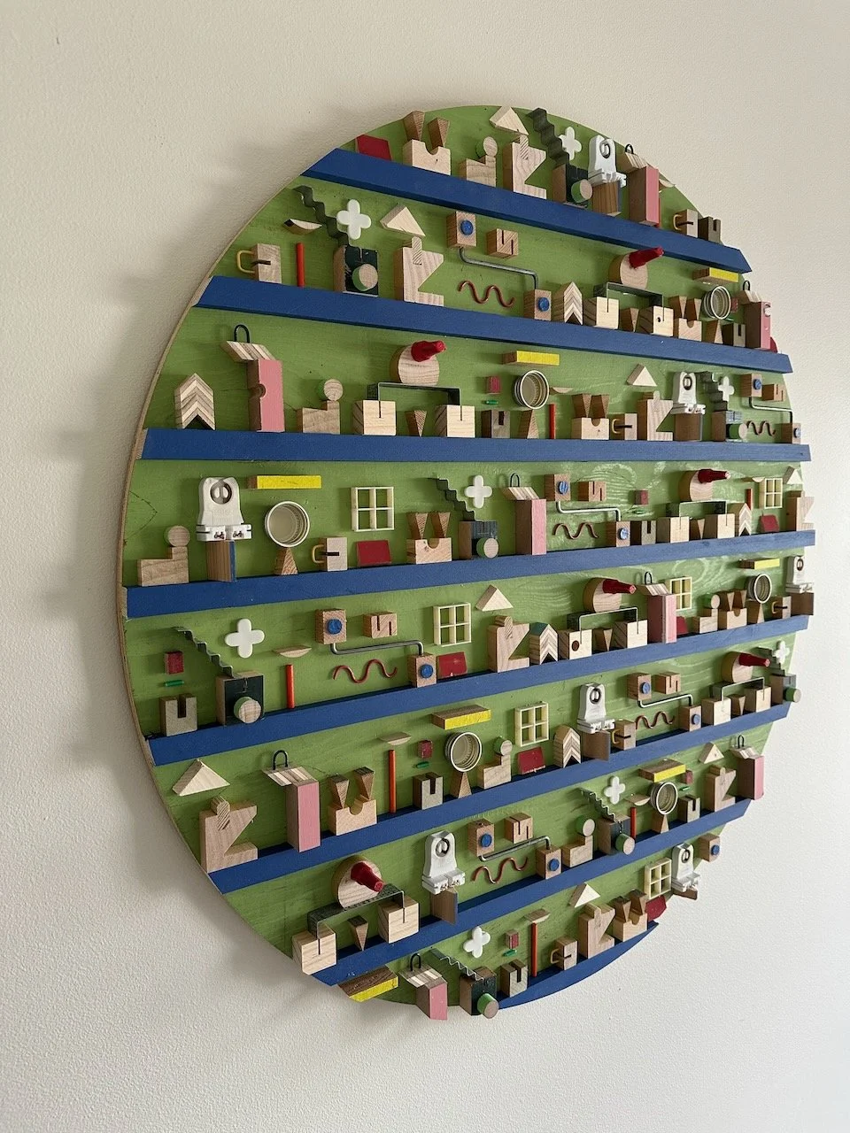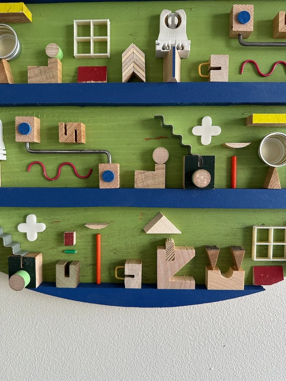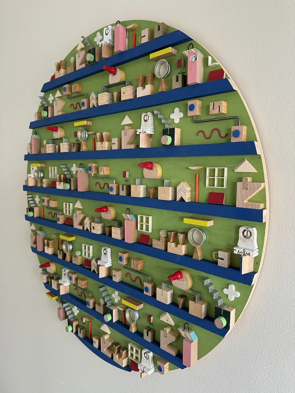 i'm hooked on this series, so i took it up a little level and made this one a bit larger than previous iterations. i found the institutional green background 1/2" plywood in the trash at the local art supply store. score! partial material list: metal banding, political sign rods, wire nuts, dumpster fluorescent light sockets and wiring, drop-ceiling light grid plastic stuff, tile spacers, custom wood shape slices (various species). 2025!