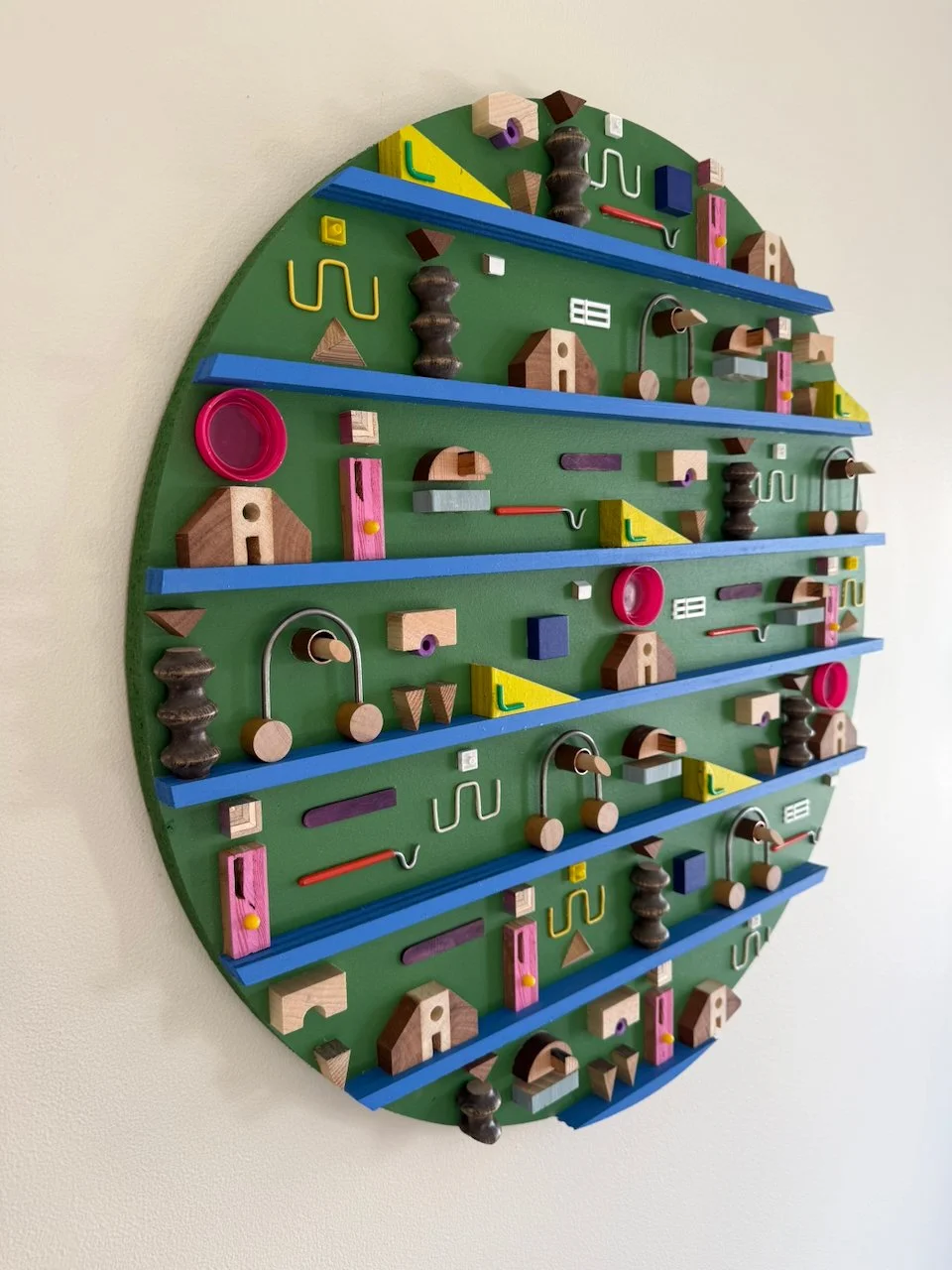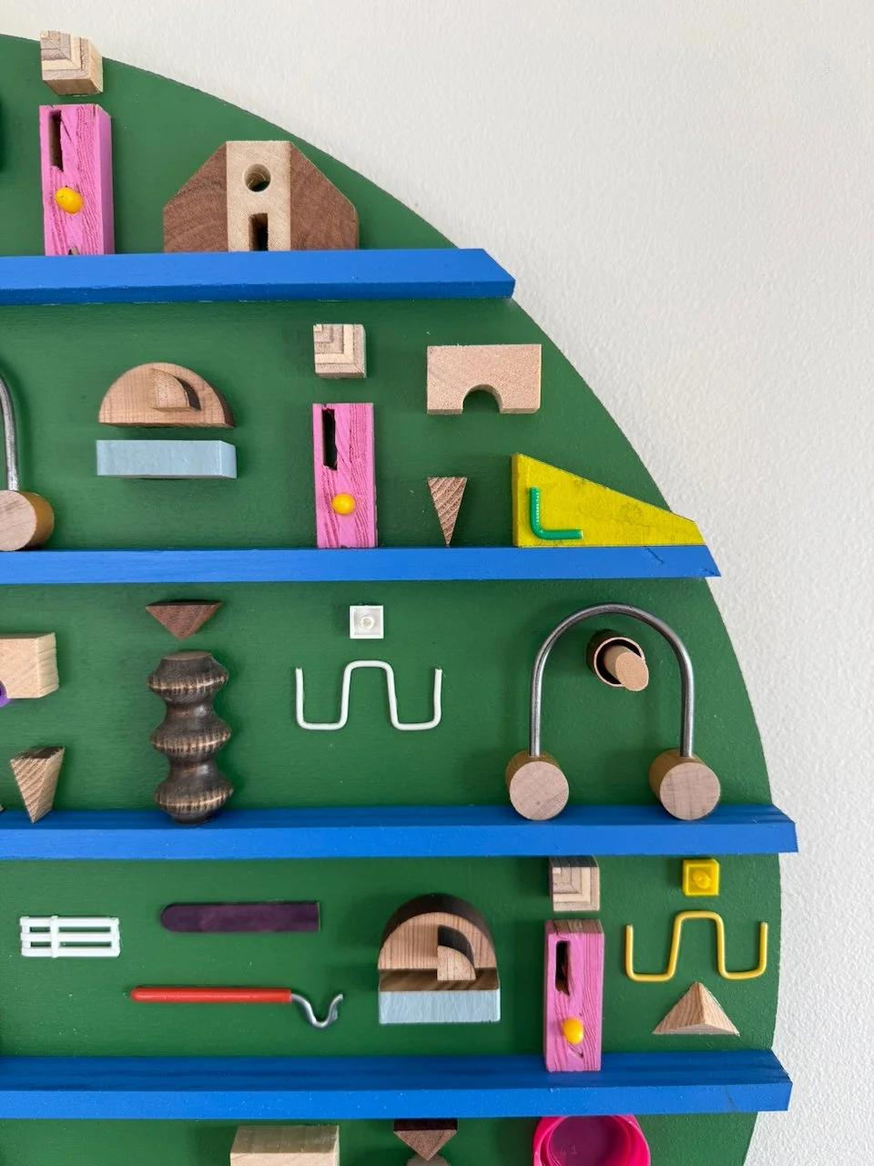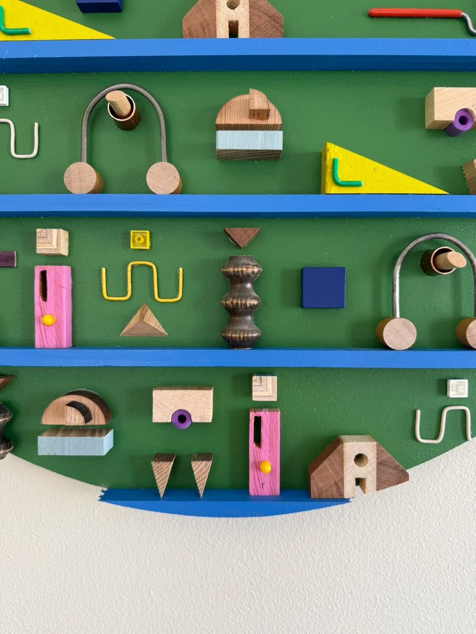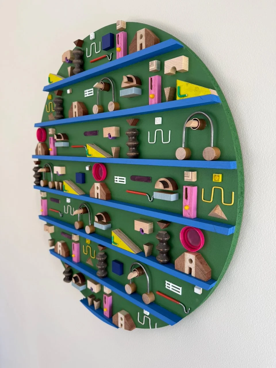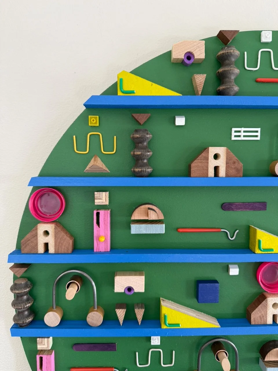 this is the second piece in the mini-series (as mentioned in the description for residual geometry v). more great paint colors from my craigslist deal. materials for this one include: pre-painted plywood found on a cubby that a local elementary school was throwing away, juice bottle caps, steel rod from election signage, more electric wire, color popsicle sticks, fabricated custom wooden “A” shapes, nerf ‘bullets’, copper, various woods, random found toy pieces. made in 2025.