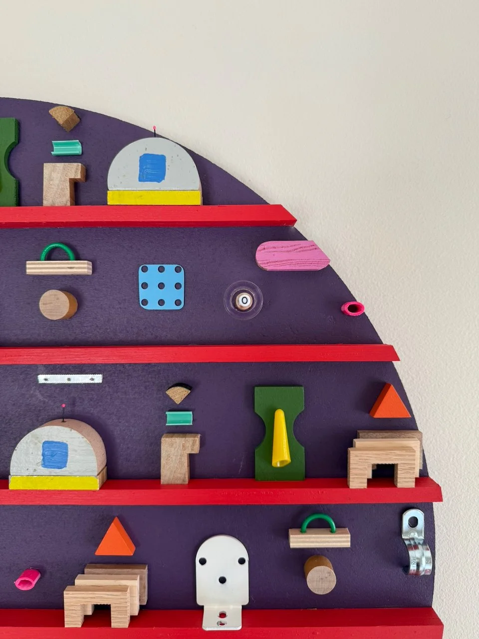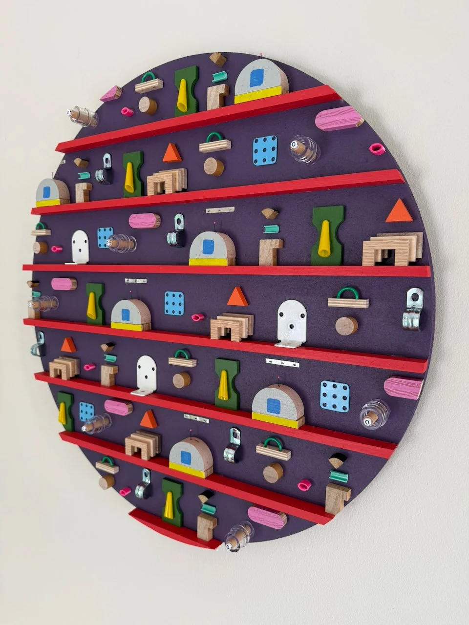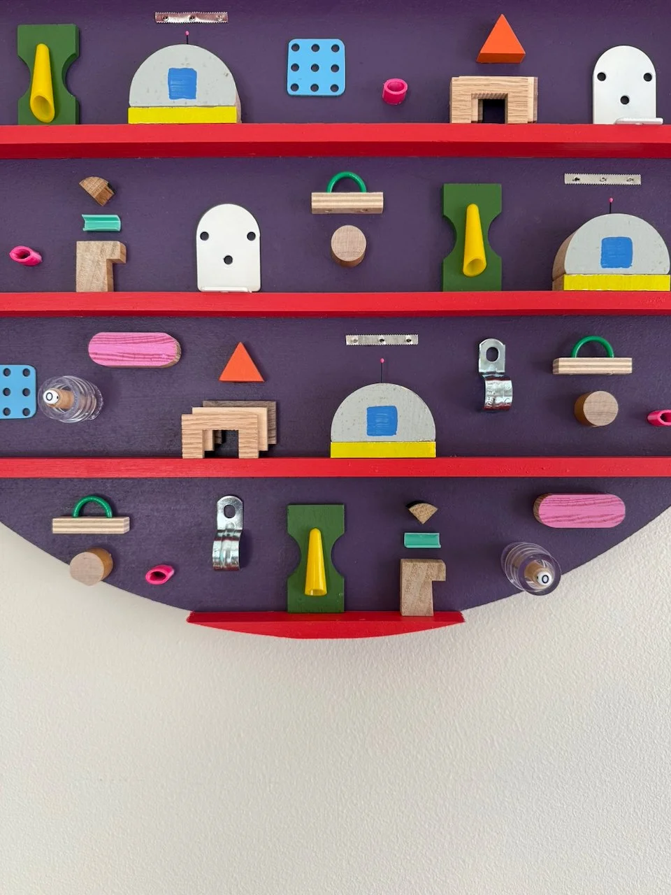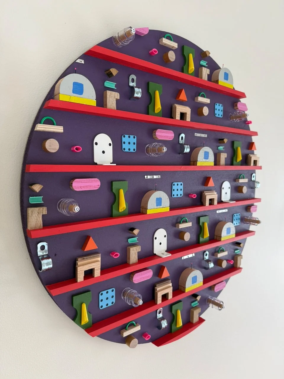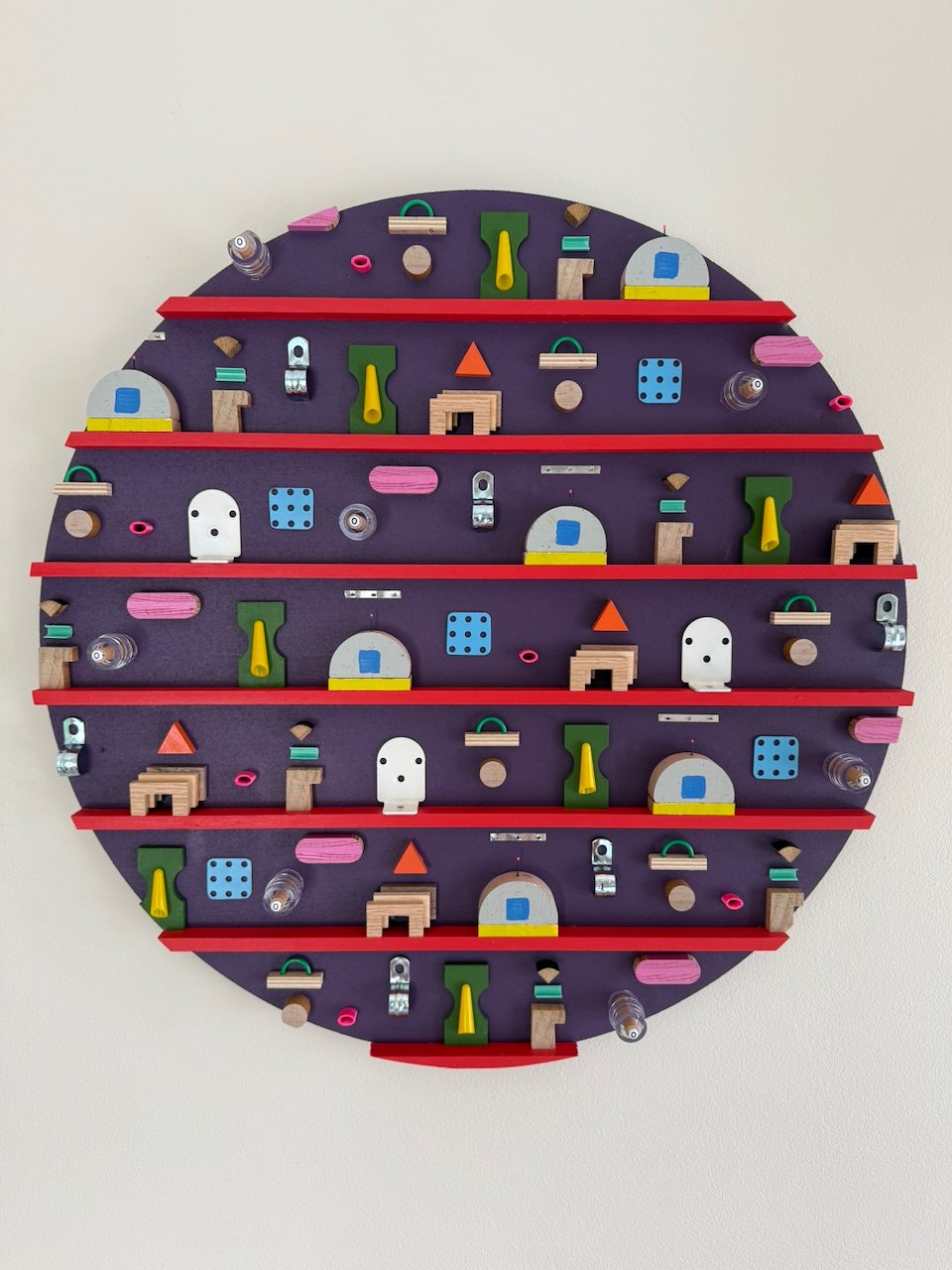 the final piece in the mini-series. new colors and continuing to explore the right amount of density in the broader residual geometry series. some materials on vii: fabricated three-species layered wooden “arches”, conduit clips, electrical wire, toy pegboard, medical supplies, plastic waste, roman shade brackets, aluminum foil serrated cut-strip, hairbrush tines. thanks to conan for the hairbrush tine idea. made in 2025.