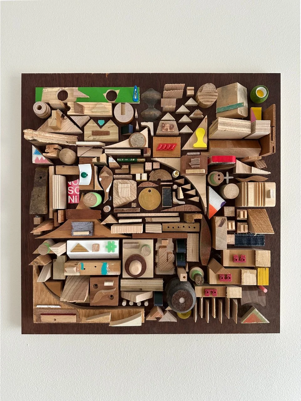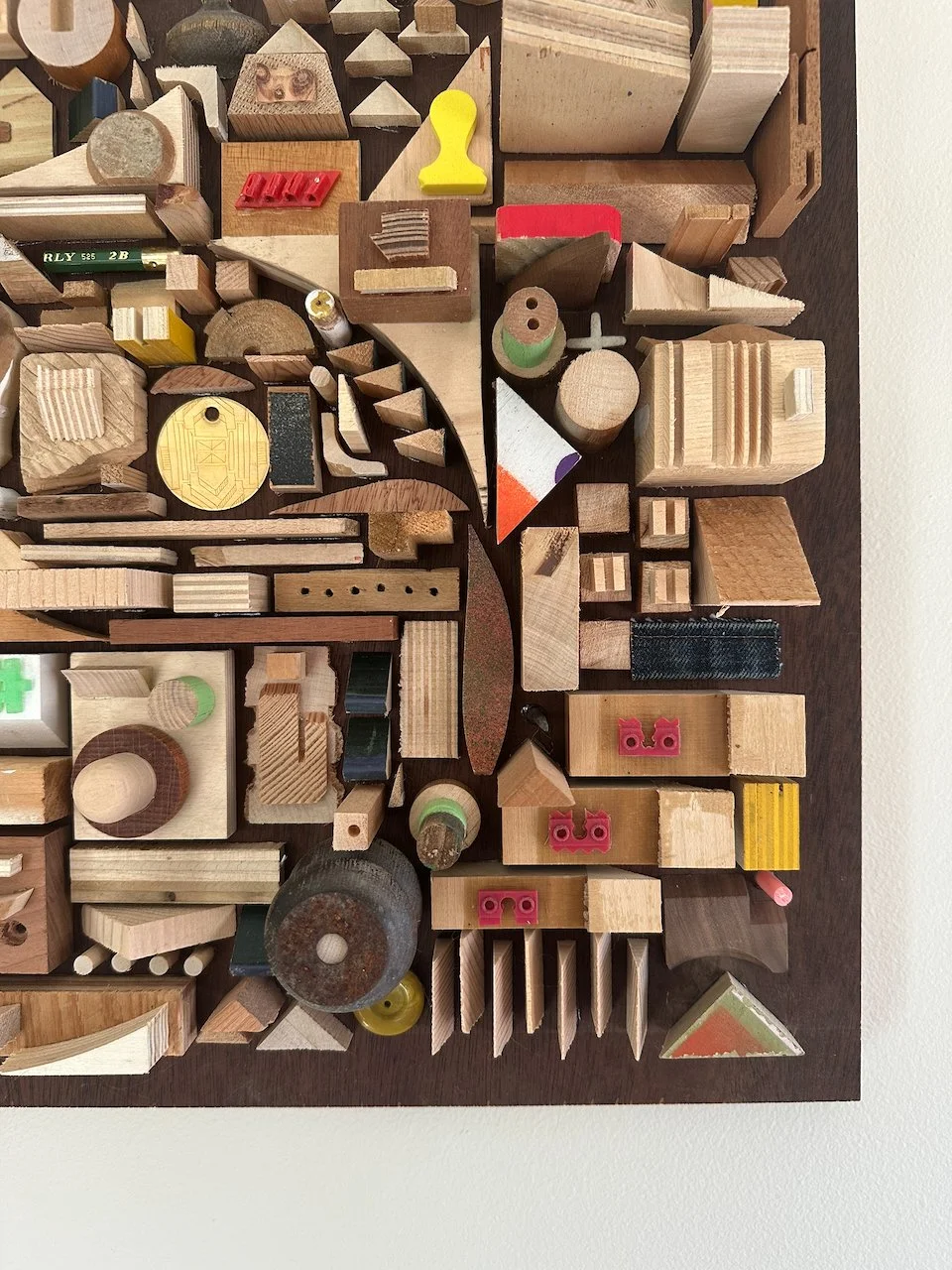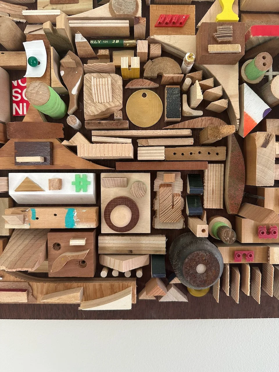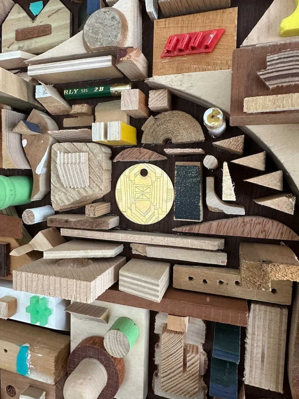 a square with a border. what a concept! i wanted to try a piece with smaller components and a border/edge. i didn't make it for anyone in particular, but i'm really happy with how it came out. materials were mostly wood on this one. a nice stained poplar backer from a desk i found on the street and deconstructed, some lead paint from back in the day, various pieces of street chairs, a carved brass disc from an old project.