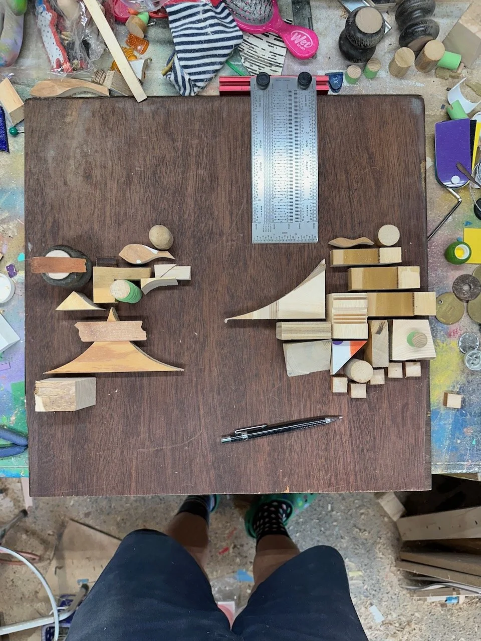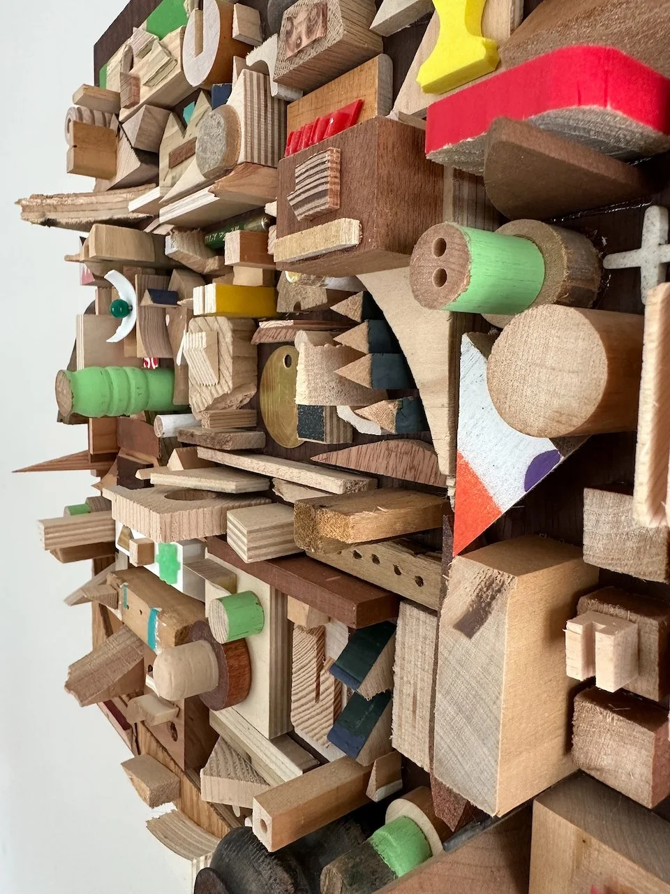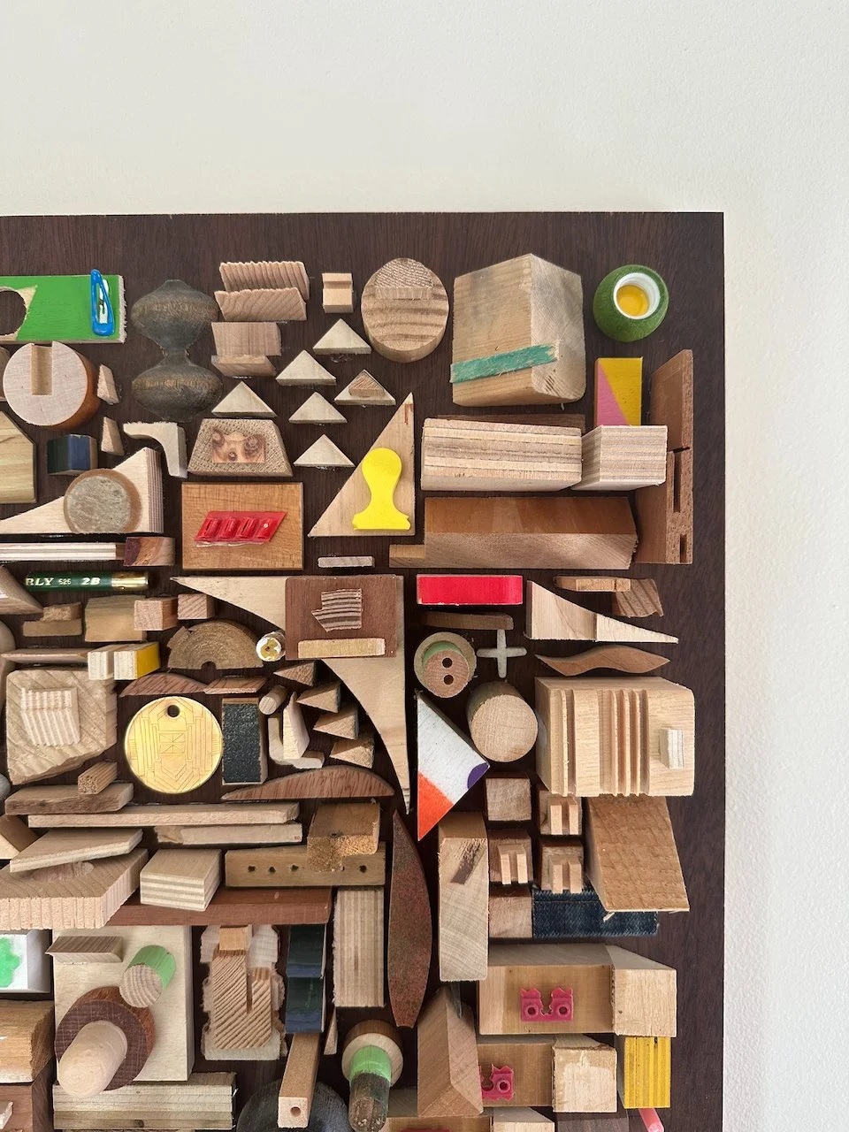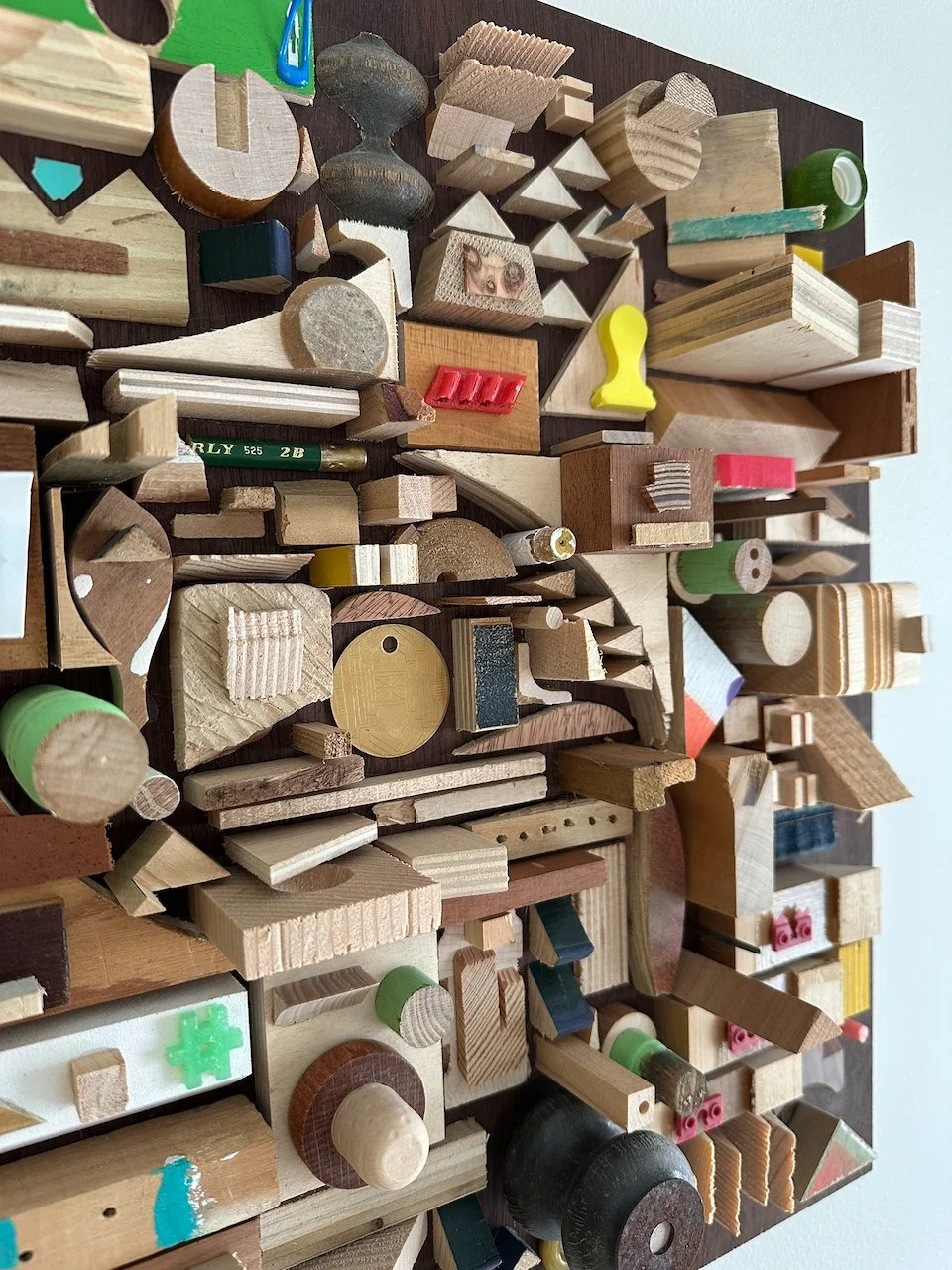 a square with a border. what a concept! i wanted to try a piece with smaller components and a border/edge. i didn't make it for anyone in particular, but i'm really happy with how it came out. materials were mostly wood on this one. a nice stained poplar backer from a desk i found on the street and deconstructed, some lead paint from back in the day, various pieces of street chairs, a carved brass disc from an old project.