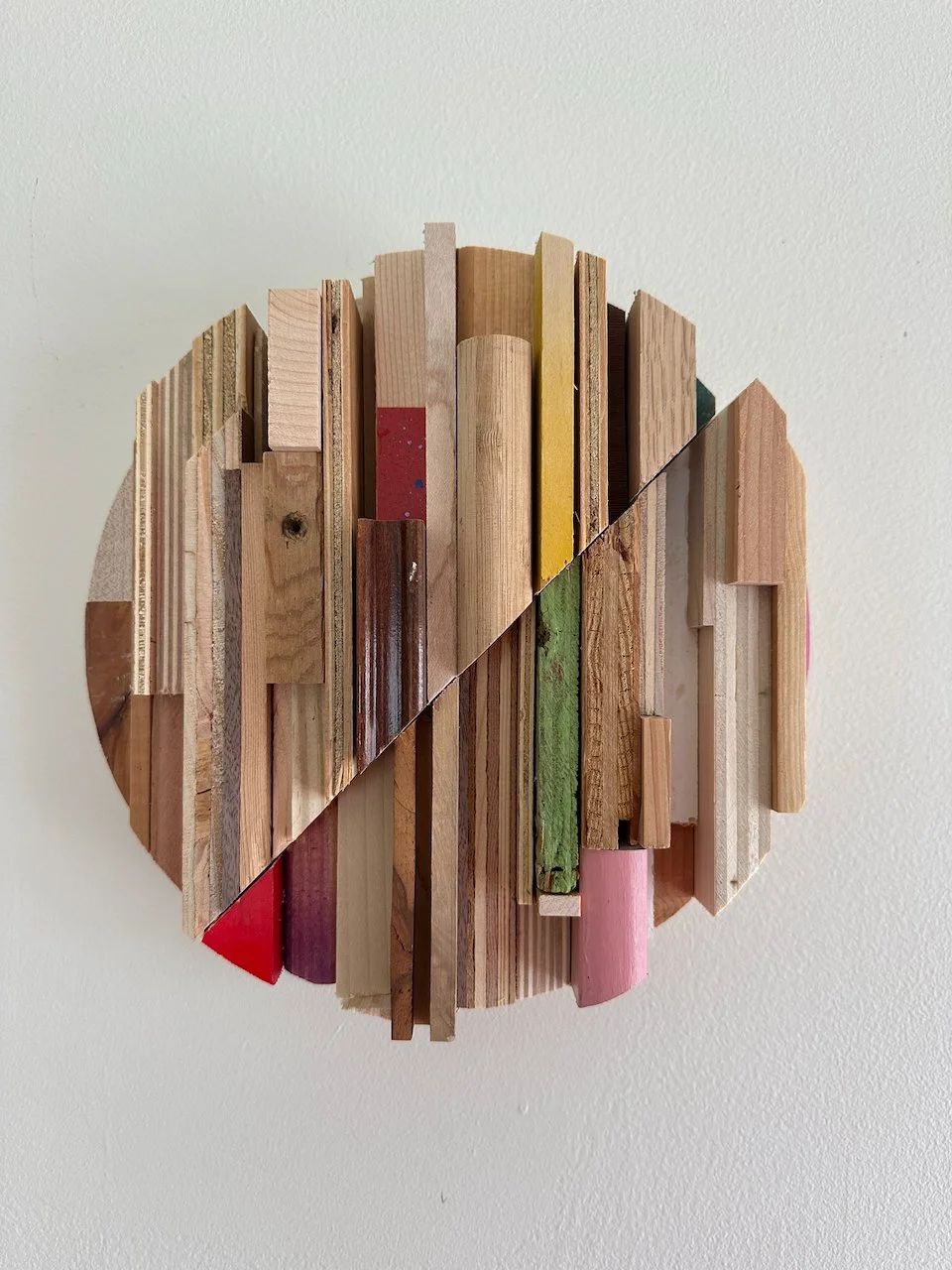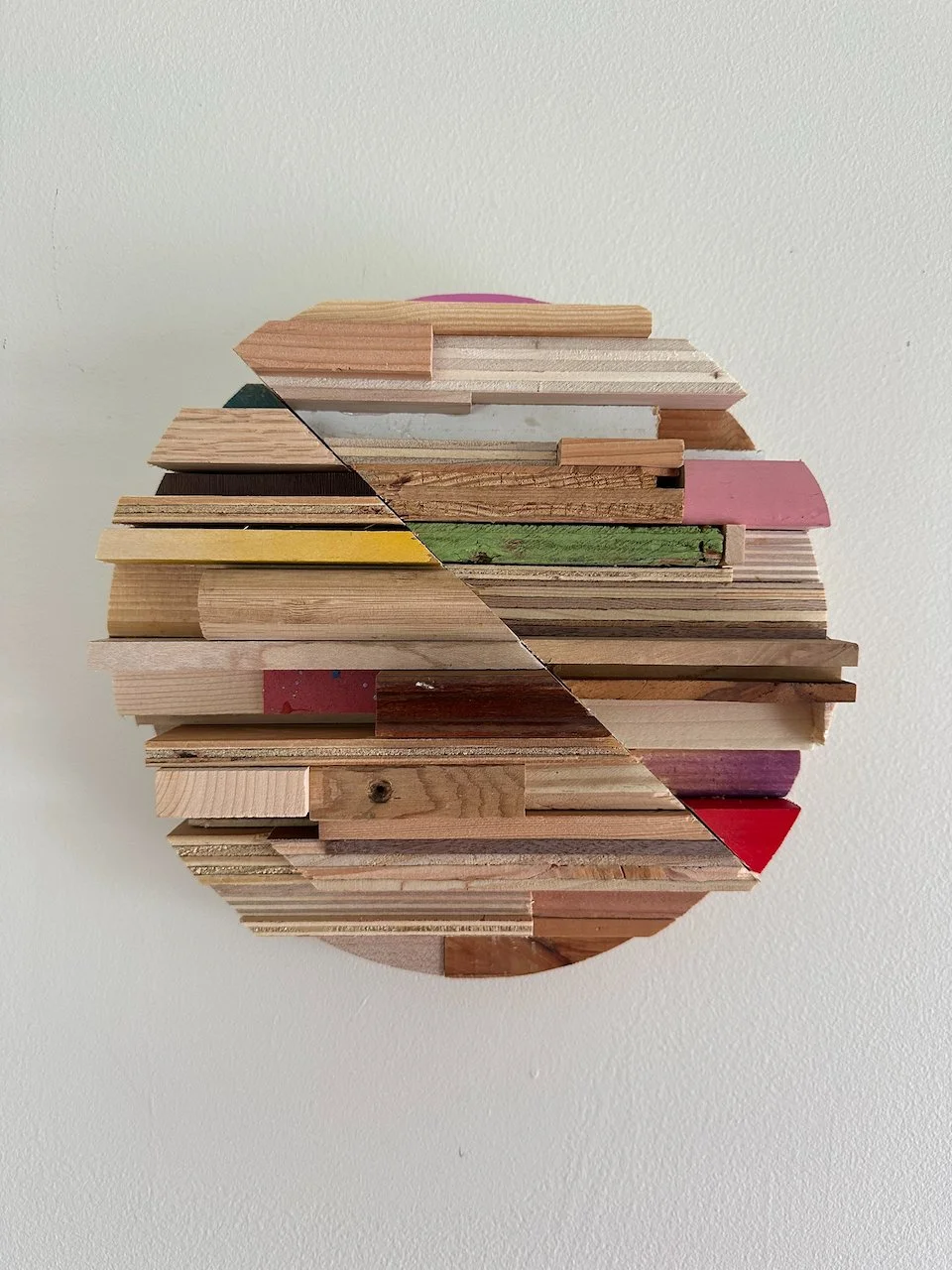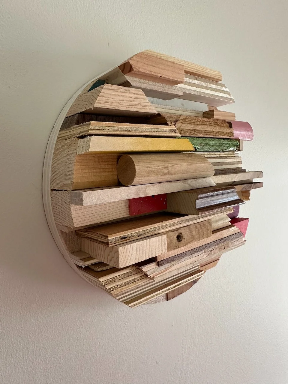 materials included plywood backer and different wood materials, including a fragment of walnut, a fiber board chunk from an abandoned kid's desk, and a slice of maple taken from one of the many boards my family hauled around every time we moved during my childhood. can be hung in different orientations depending on preference.