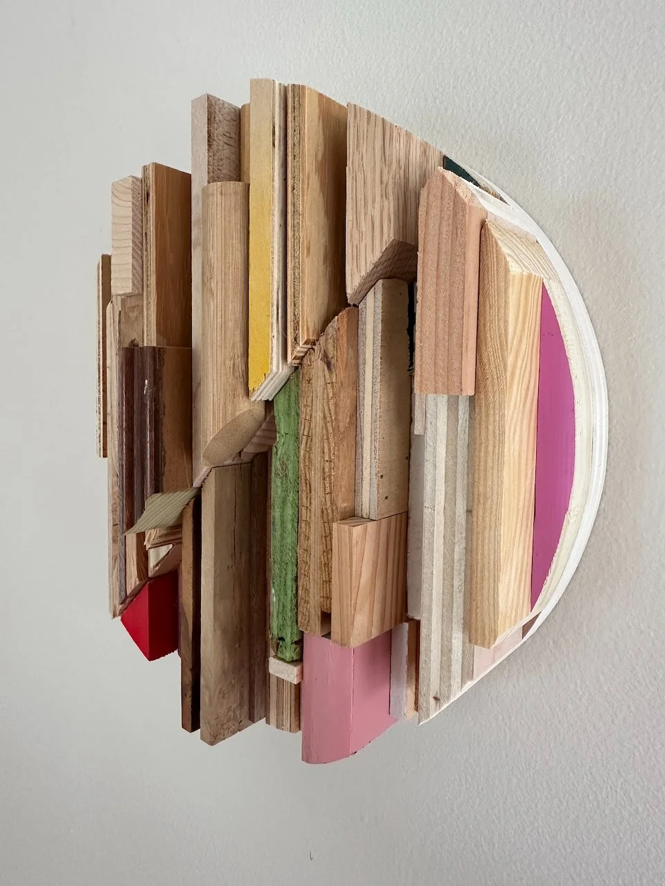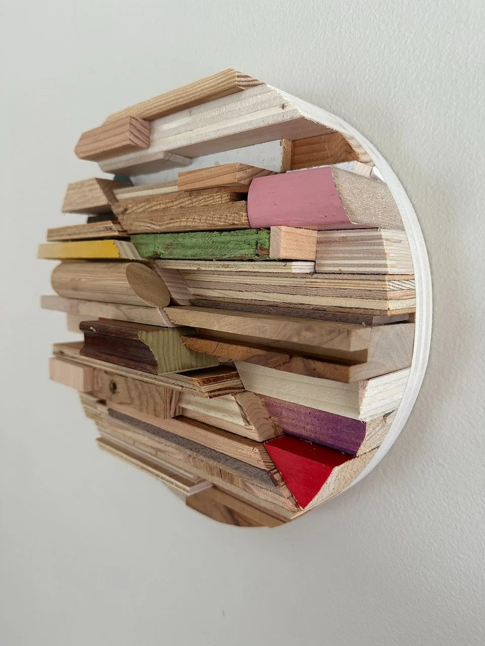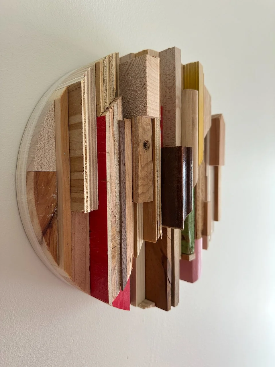 materials included plywood backer and different wood materials, including a fragment of walnut, a fiber board chunk from an abandoned kid's desk, and a slice of maple taken from one of the many boards my family hauled around every time we moved during my childhood. can be hung in different orientations depending on preference.